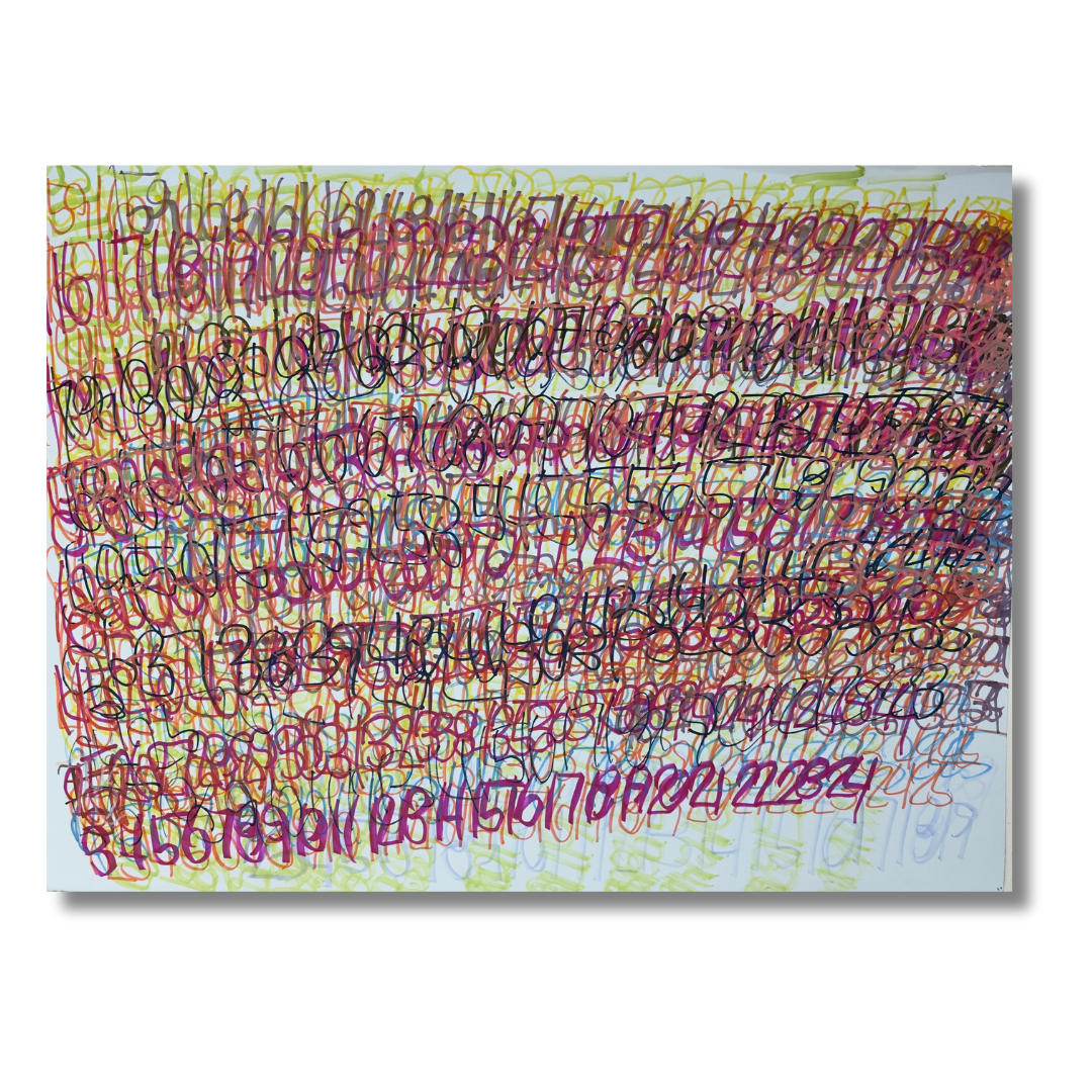 Zachery creates with a sense of wonder and precision, blending play and structure in every piece. He works with a variety of materials such as acrylic on canvas, wood, paper, and paint pens, layering marks and numbers in both intentional and spontaneous ways. Fascinated by numbers, he weaves them into his art with a style reminiscent of Jasper Johns, turning simple figures into bold, colorful compositions.