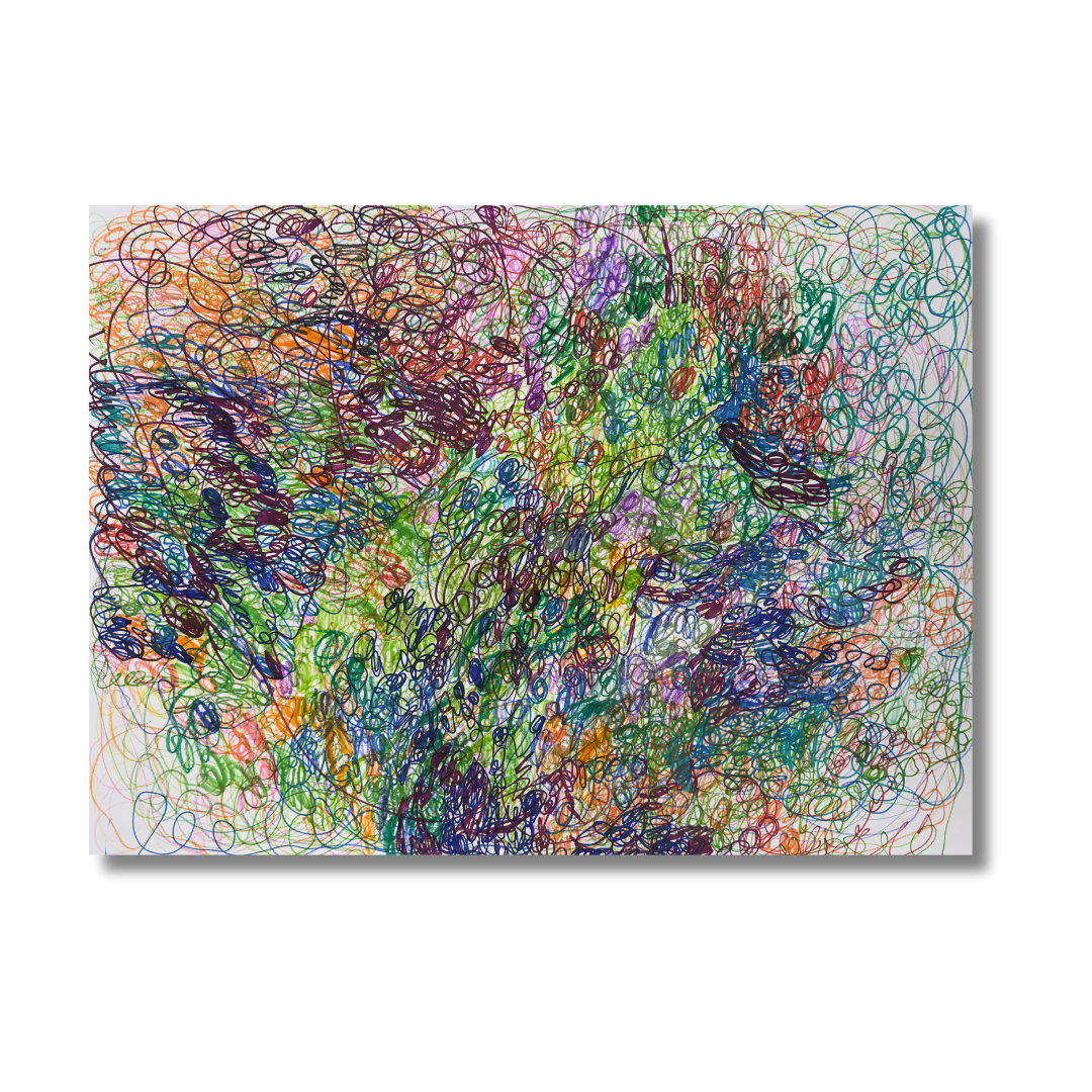 Kathleen embodies confidence and determination, always keeping her head held high as she pursues her passions. As an outgoing and dynamic artist, her creations are a vibrant reflection of her personality. What began as simple ballpoint sketches in wire-bound notebooks has transformed into large-scale pieces that convey intricate layers representing her determination. Her "scribble drawings" continue to grow in scale and impact, radiating a sense of accomplishment amidst the chaos.