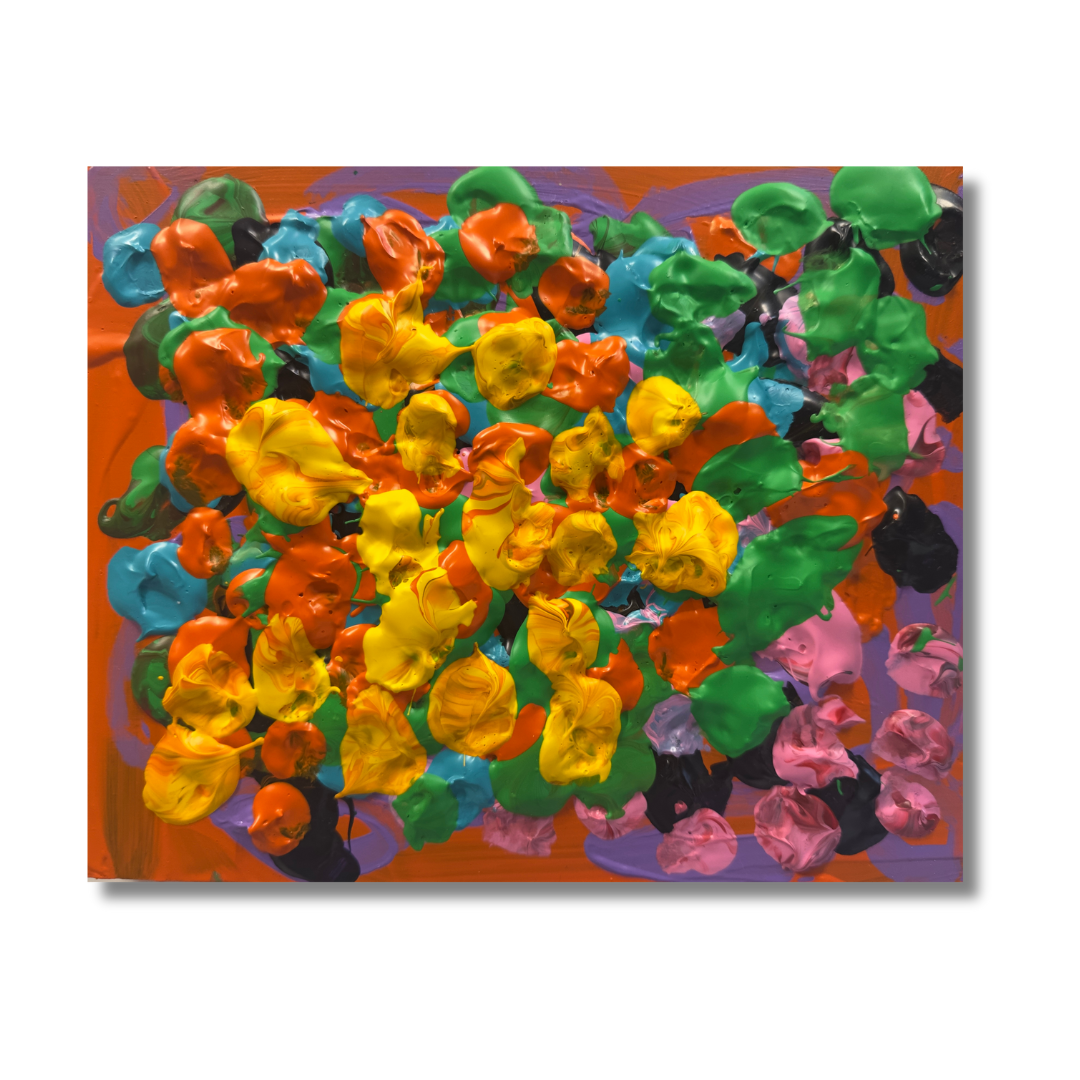 However, Anna Claire’s methodology sets her apart. She begins by filling all six wells of her paint tray with an array of vibrant colors, then simultaneously develops six separate paintings, adding one color to each. The result is a harmonious collection, where each piece stands alone like a field of flowers or a galaxy, collectively radiating love and light.
