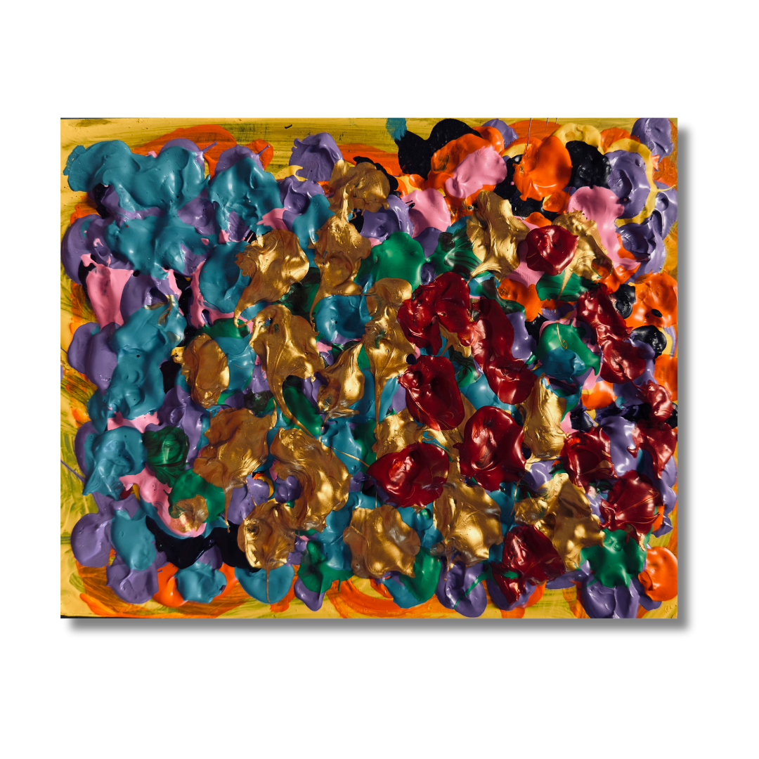 However, Anna Claire’s methodology sets her apart. She begins by filling all six wells of her paint tray with an array of vibrant colors, then simultaneously develops six separate paintings, adding one color to each. The result is a harmonious collection, where each piece stands alone like a field of flowers or a galaxy, collectively radiating love and light.