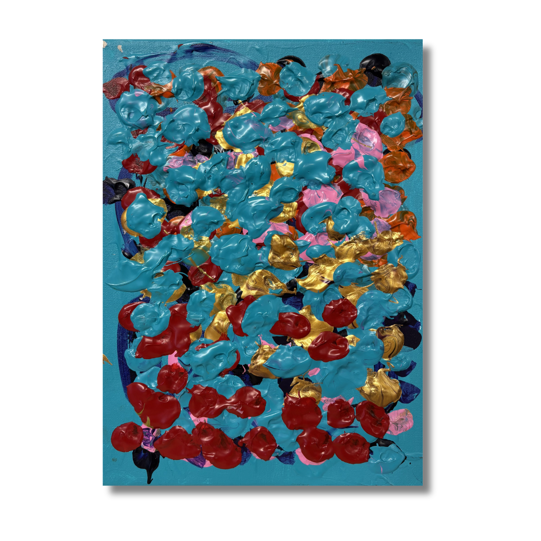 However, Anna Claire’s methodology sets her apart. She begins by filling all six wells of her paint tray with an array of vibrant colors, then simultaneously develops six separate paintings, adding one color to each. The result is a harmonious collection, where each piece stands alone like a field of flowers or a galaxy, collectively radiating love and light.