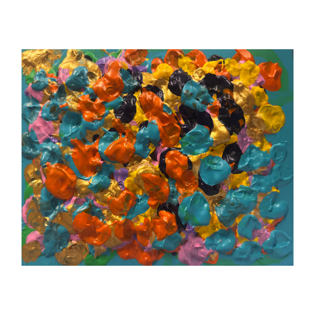 Anna Claire’s textured paintings are a captivating exploration of color, featuring repetitive circles and dots that invite viewer engagement.